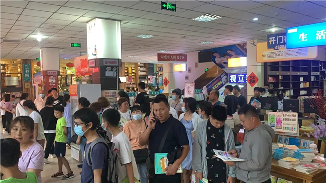 书店里人来人往、热闹非凡,孩子们捧着课外读物看得津津有味、许多读者朋友想趁着打折买一些书籍,由于客流量大,收款台前排起长队。